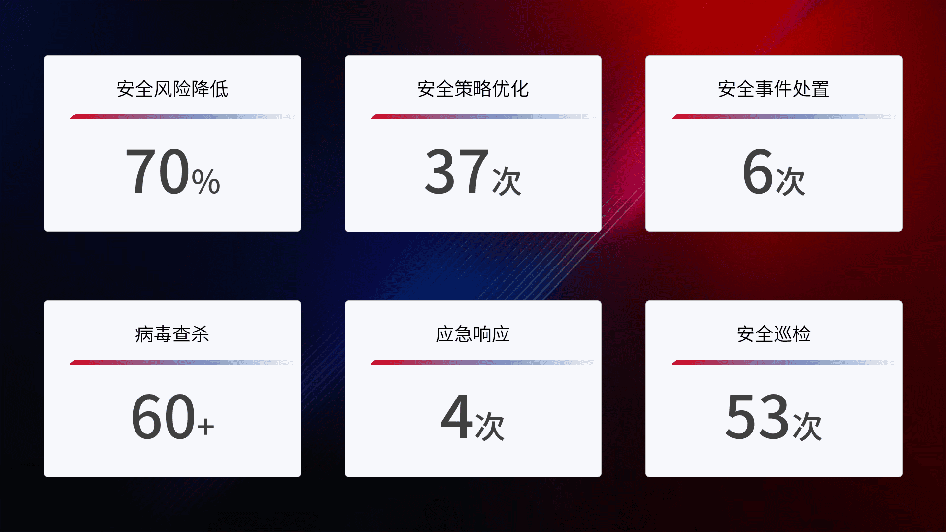 提供全面的安全事件报告体系,,,,包括处置报告、、、周报、、、季度和年度总结,,结合持续监控,,,帮助客户深入了解网络安全状况。。